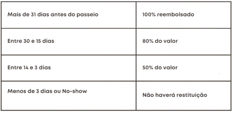 • Nestes casos, o passeio poderá ser remarcado, ou na impossibilidade de uma nova data, será realizado o reembolso do valor total pago.